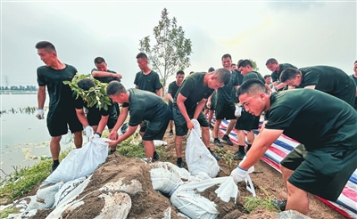 昨天中午,大清河新盖房分泄洪水水头位置已到达我市,距离静海区台头镇2公里。此刻,大清河台头镇段南北堤上,烈日当空。特战大队、特战一中队、党员先锋突击队……一面面红色队旗,迎风招展。面对即将到来的洪水,来自武警天津总队的1800余名武警官兵奋战在南北堤上,分秒必争地除险加固,全力守护人民群众生命财产安全。