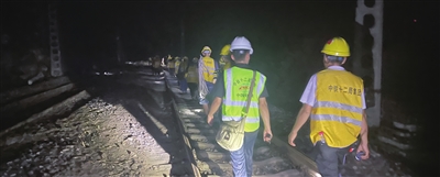 8月2日夜间,中铁十二局电气化公司紧急奔赴丰沙铁路落坡岭车站开展线路巡检作业。 通讯员 张钰喆