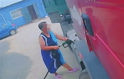 路先生提供了两段近期拍摄的视频,第一段在喜邦公路西侧一处停车场内,一辆河北牌照的白色厢式货车内藏有加油罐和加油枪,视频中的男子正在给一辆红色的货车加油。另外一段拍摄于贾各庄村的一处停车场内,一辆写有“爆”字的油罐车旁边,一名中年女子从油罐车下方的小铁柜子里拿出油枪,为一辆红色大货车加油。路先生说,像这样暗藏“黑加油站”的停车场还有好几处。