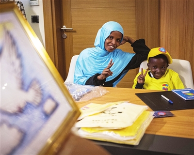 9月13日,在索马里首都摩加迪沙,获奖儿童卡伍基卜·穆罕默德(右)与学校教师合影。