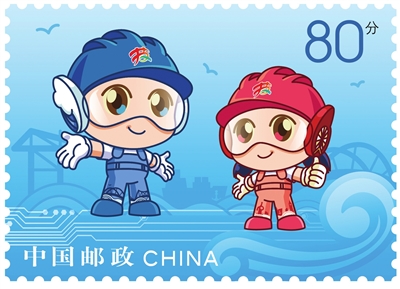 该枚明信片邮资图,以本届赛会吉祥物“天天”和“津津”为主体,以港口、桥梁、电路元素、海河浪花等元素为背景,两个吉祥物昂首挺立于渤海之滨,笑迎全国宾客。明信片主图部分以“技能蓝”为主色调,将天津地标建筑、比赛场馆以及本届大赛八大赛项代表图形融为一体,并与大赛名称、口号相辅相成,进一步点明主题,寓意此次大赛在津举办圆满成功。