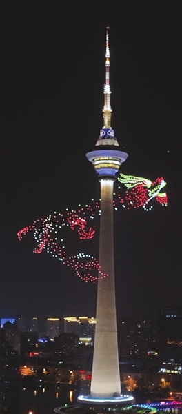“无人机‘飞龙’在盘旋至天塔塔顶后,变化为一面五星红旗,在夜空中冉冉升起。”