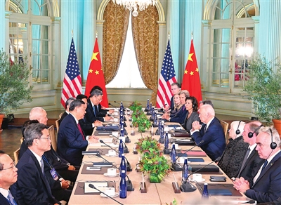 习近平指出,当今世界正经历百年未有之大变局,中美有两种选择:一种是加强团结合作,携手应对全球性挑战,促进世界安全和繁荣。另一种是抱持零和思维,挑动阵营对立,让世界走向动荡和分裂。两种选择代表着两个方向,将决定人类前途和地球未来。作为世界上最重要的双边关系,中美关系要放在这个大背景下思考和谋划。中美不打交道是不行的,想改变对方是不切实际的,冲突对抗的后果是谁都不能承受的。大国竞争解决不了中美两国和世界面临的问题。这个地球容得下中美两国。中美各自的成功是彼此的机遇。