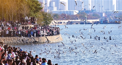 当下正值候鸟迁徙季,连日来,不少迁徙越冬的红嘴鸥在滨海新区上海道附近的老码头海河河畔翩翩飞舞,吸引众多市民驻足观赏。 本报记者 吴迪 摄