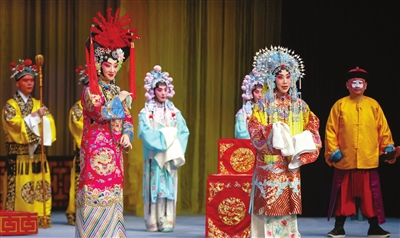 昨日首场演出的《红鬃烈马》讲述相府三小姐王宝钏苦守寒窑18年,最终与丈夫薛平贵团圆的故事。剧中生旦净丑行当齐全,有许多耳熟能详的唱段,观众喜闻乐见。此次演出,薛平贵由万琳、李奕宣饰演,王宝钏由曹馨月、张其婷饰演,代战公主由张婵玉饰演。青年人舞台形象亮丽,不同流派的演员饰演同一角色,表演各具特色。