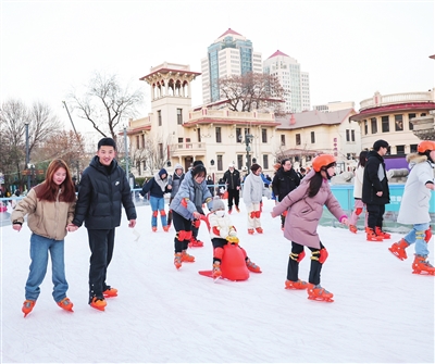 意风区内熙熙攘攘,滑冰场在灯光映射下闪闪发亮,像一颗钻石镶嵌在深邃的夜空。结合意风区的资源优势,滑冰场精心打造了光影主题项目,将滑冰运动和声光电光影技术相结合,为游客冬季游玩增添一个新选择。来自广东的陈潇告诉记者:“第一次来天津玩,第一次见到户外冰场,因为我们那边比较暖嘛,也是第一次体验这种冰刀,就感觉回到了上世纪90年代,小时候在电视上看到电视剧《血色浪漫》里的那种感觉,蛮刺激的。”