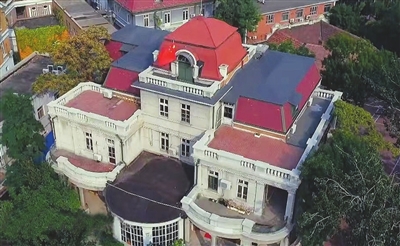 章瑞庭的住宅为今花园路9号,建于1922年,由奥地利建筑师盖苓设计。为回避法国花园这个热闹的公共活动空间,院落主入口开在今营口道和辽宁路的交口处,沿院墙边设置的廊厦可直达主楼后门。入口处设平房多间,为门卫室、接待室、厨房、佣人住房、汽车库、教室等,涵盖了基本的服务设施和部分公共活动用房。主楼为三层砖木结构,最为抢眼的是具有法国建筑特征的孟莎式屋顶。室内装饰大气豪华,一楼花厅顶部为玻璃罩,临街立面更是用大面积色彩艳丽的玻璃拼接成各种植物图案,厅内中部有四根八角形柱子,柱间为喷水池。楼内设有密道连通楼顶和地下室,二楼设有密室,钢质的防弹门藏在卫生间巨大的穿衣镜后面,用钥匙开启穿衣镜方能得见密室入口。有了丰厚的资产、豪华安全的住宅,章瑞庭并没有花天酒地、歌舞升平,他把大量的精力和财产投向了青少年的成长和城市文化的发展。