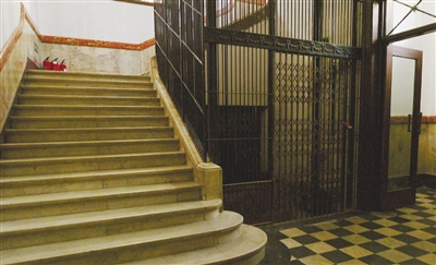 营业厅周围为办公室、打字间、账目库、保险库等。主要房间大门的玻璃上,都标有相应房间的英文名称,文字均与玻璃一体成型。特别是电话间的门,因为只在使用时才关闭,名称就标在门内侧的玻璃上,门扇打开时文字刚好是正向,可见设计师心思缜密。二、三层为办公室、会客室、宿舍等。建筑东北隅,一部近百年历史的奥的斯电梯保存完好,现在仍可正常运行。它也是天津现存最古老的电梯之一。电梯四周为镂空铁艺围栏,周围被楼梯环绕,电梯内部构造清晰可见。