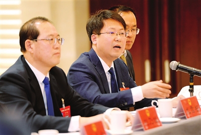 代表们分组审议政府工作报告。