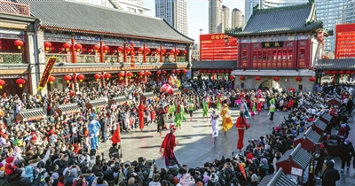 金龙献瑞,古文化街非遗民俗展演精彩纷呈,舞龙、高跷等浓浓的年味儿吸引了众多市民前来“打卡”。本报记者 胡凌云 摄