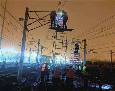 2月3日至5日,合肥市突降大雪,来势汹汹的低温雨雪天气导致轨道交通线网各车辆段接触网出现覆冰现象,对轨道交通线路安全运行带来隐患。为确保线路安全,正在参建合肥轨道交通8号线建设的中铁十二局集团电气化工程有限公司建设者们主动请缨,无偿提供专业人员和设备支持,先后选派多名党员干部职工奔赴合肥轨道线网场段积极联合运营供电专业人员开展露天区段接触网覆冰抢险工作。抢险队员们不畏严寒、昼夜奋战,在凛冽的寒风和飘零的雪花中,穿上绝缘作业服装,上线带电除冰,保障了运营线路列车正常运行。他们用责任与担当、勇敢与坚守为广大市民乘客的平安出行构筑起了坚固防线,充分彰显了国有企业的社会责任和担当精神。