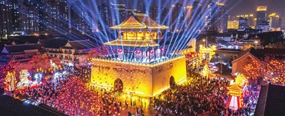 “龙耀津门、爱在南开”2024天津鼓楼新春灯会市集2月10日正式开放,璀璨灯光点亮最美津城夜空,鼓楼广场人潮汹涌,挤满了前来打卡的游人。金龙迎宾、仙凤迎春等16个大型灯组全部点亮,簇拥着灯火灿烂的鼓楼,洋溢着浓厚的喜庆氛围。高跷、舞龙、川剧变脸、古筝演奏等民俗文化表演异彩纷呈、引人入胜,令游客流连忘返。本报记者 廖晨霞 胡凌云 通讯员 石乔 王英浩 摄