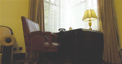 当年毛主席入住的是一个大约25平方米、带有独立卫生间的房间。横跨两面墙的宽大角窗视野开阔、采光充沛,正对着绿意盎然的花园。翠绿的草坪和爬满拱廊的紫藤装点了这里的窗外风景。室内设有一部在新中国成立伊始尚属罕见的黑色电话。沿窗摆放的厚重书桌和雕花座椅是当年主席曾用过的原物。