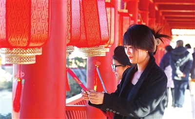 走进庙会现场,迎面龙门两侧,“一脉文心兴宝地,百番花事奉新春”的春联光彩夺目,公园里1000多组大红灯笼、灯谜、树挂灯饰迎春纳福,寓意新年鸿运相伴。