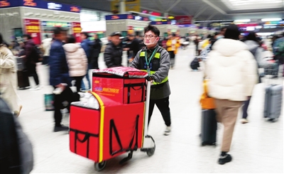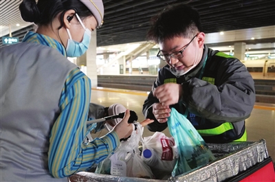 “10点01分,正点开车,送餐车厢是9车。”2月15日,在国铁郑州局旅游集团郑州东站12306网络订餐配送中心,配送员李龙基和同事核对完配餐车次和信息后,推上送餐车,开始了一天的忙碌。