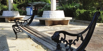 5月10日,记者来到昌宁南里9号楼对面的小区休闲公园,园区内座椅损坏程度不一,最严重的一张座椅只剩下支撑铁架,还有一张座椅的靠背木板不见踪影。小区居民刘大爷向记者介绍,这个情况已经存在数月了,一直不见有人维修,影响市民正常使用。
