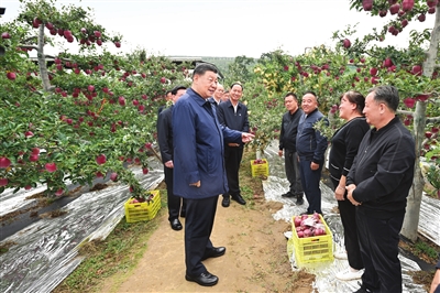 红彤彤的花牛苹果挂满枝头,一派丰收景象。习近平走进果林,了解相关种植、技术和管理情况。他说,乡村振兴关键在产业振兴。经过70多年培育发展,花牛苹果品牌更响亮了。要加强品种保护和培育,优化种植方式,创新营销模式,把这个特色产业做得更大,带动更多群众增收致富。他祝乡亲们的生活像苹果一样红红火火。