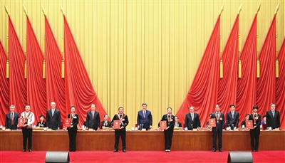 在欢快的乐曲声中,习近平等为受表彰的模范个人和模范集体代表颁奖。