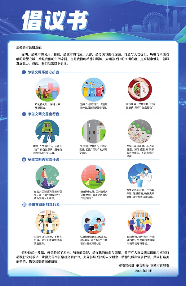 本报讯(记者 孟若冰)“俯身捡起一片纸,就是捡起了未来。城市的美好,是你我的使命与荣耀。”市委宣传部、市文明办、市城市管理委今日向全市发出倡议,号召人人争做文明环境守护者、文明交通出行者、文明养宠责任者、文明服务践行者,以自身的文明行为充分彰显天津的人文理念、精神气质和宜居智慧,共同打造美丽整洁、物阜民熙的城市新貌。