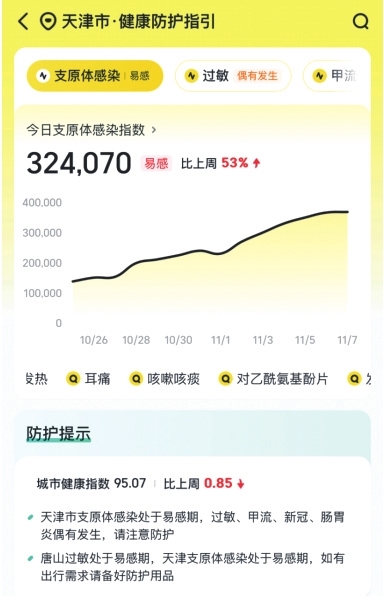 美团买药健康指数显示,近一周以来,天津地区支原体感染相关指数已连续七日出现上涨。据了解,线下医院也出现相同的趋势。天津市儿童医院在接受媒体采访时表示,医院就诊患儿数量的确比前一段时间有所增加,就诊患儿80%~90%都是呼吸道感染。但与去年同期比较,门急诊患儿数量并未增加、住院患儿数量持平。
