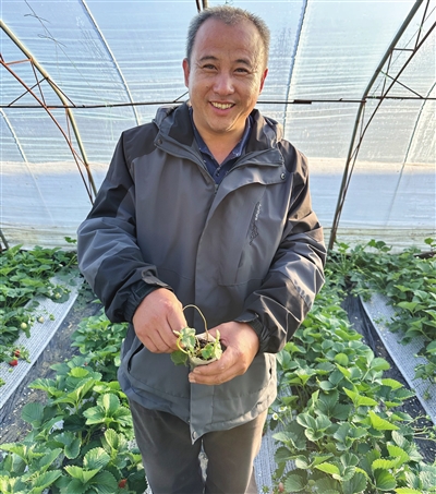 “我们采用了冷冻苗种植技术,主要是为了促进花芽分化,拉开昼夜温差,让所有的营养聚集在根系。冷冻苗种植技术还有一个好处,就是在冷冻的过程当中,草莓苗里所有的细菌都已经被冻死了,种植到大棚里之后长得健硕,基本上不使用农药,纯绿色种植。”正在大棚里梳果的赵海秋说。