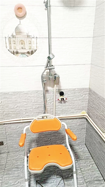 当滩头村五保户刘继怀属于分散特供供养人,评估团队为他配置了助浴椅、抓杆和四脚拐杖。助浴椅经专业人员安装后,结实耐用,坐在上面洗浴不容易摔倒。