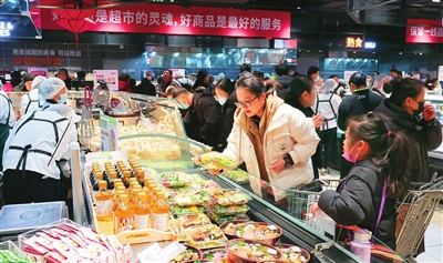 另一个高人气区域是香气四溢的熟食区。在货架前,店员一边理货一边招呼顾客:“这是我们的甜肠,在北京的调改店卖得特别好,您可以尝一尝。”张女士品尝后决定买一些,她对记者说:“我家住在空港,平时经常来永辉,这次感觉变化还是挺大的,亮堂了很多,东西更丰富了,特别是熟食的选择很多。”