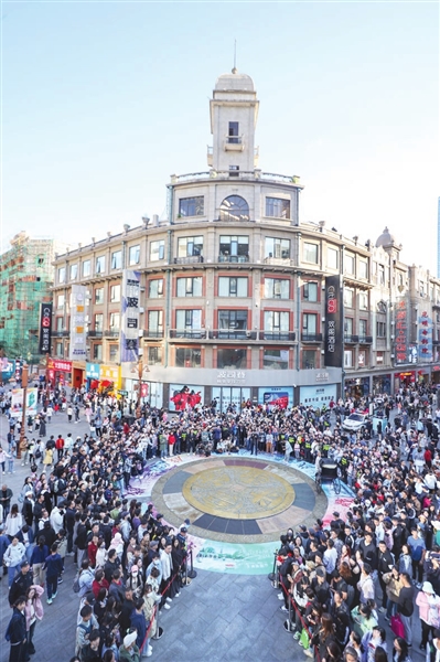 随着《日出》等沉浸式街角戏剧演出活动在社交媒体平台爆火,大铜钱广场的活动转为常态化演出。众多戏剧爱好者和游客来此打卡,为一出戏奔赴天津这座城。几乎每个有演出的时段,广场都被围得“密不透风”。除此以外,讲述诗人陆游一段人生经历的话剧《钗头凤》片段也在金街大铜钱广场和天津人民艺术剧院门口上演。