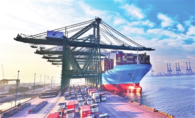 晨曦初照,巨轮穿梭。从高空俯视天津港,40多公里的海岸线上,200多个泊位星罗棋布,一艘艘巨型集装箱船靠泊天津港,一座座桥吊擎臂而立,一辆辆无人驾驶电动集卡来回穿梭,这座世界级人工深水大港最近迎来水上运输高峰。碧海蓝天之间,汽笛嘹亮悠远,一座城市改革开放的鼓点声声激扬。