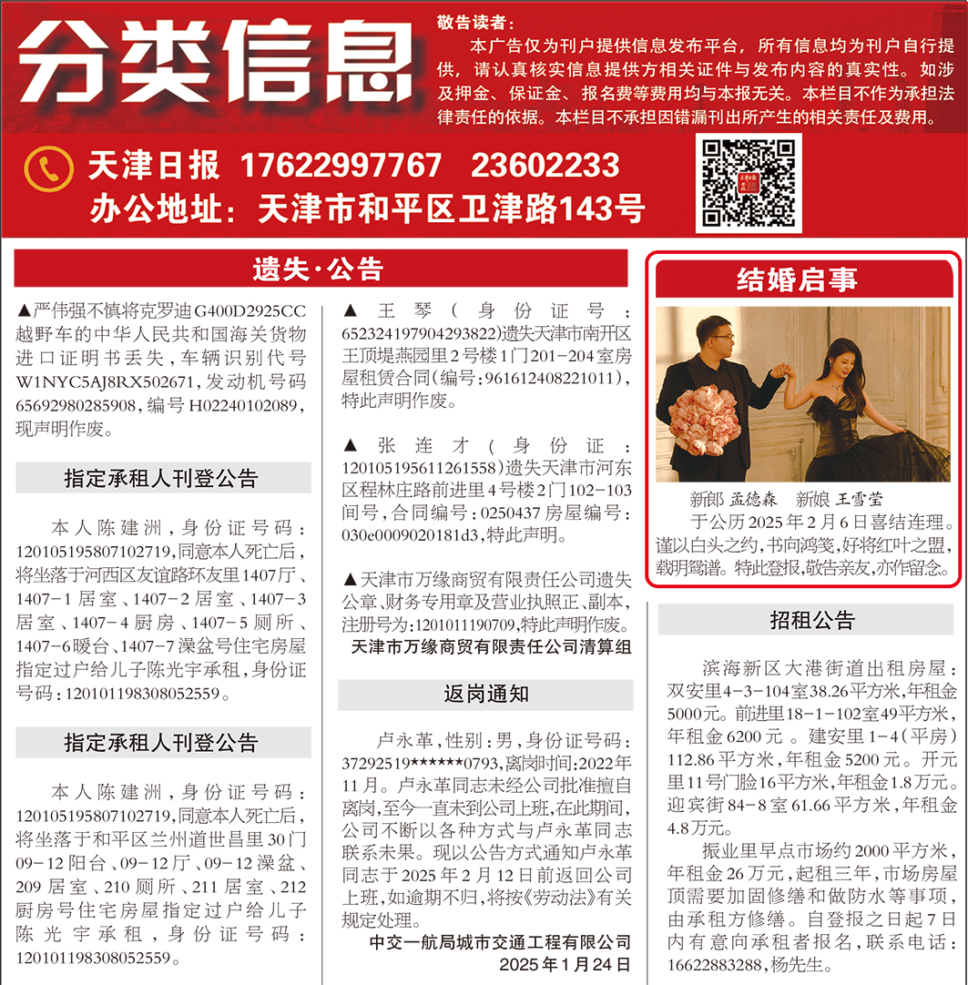 天津日报报业集团所属10报2刊所有作品,版权均属于天津日报报业集团,受《中华人民共和国著作权法》的保护。所有关于天津日报报业集团及其子报子刊内容产品的数字化应用,包括但不限于稿件签约、网络发布、转稿等业务,均需与天津日报报业集团商谈,与天津日报报业集团有互换稿件协议的网站,在转载数字报纸稿件时注明“来源-天津日报报业集团-XX报”和作者姓名,未与天津日报报业集团有协议的网站,谢绝转稿,违者必究。