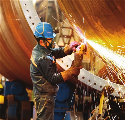江苏省连云港经济技术开发区一家风力设备公司工人生产风电塔架。
