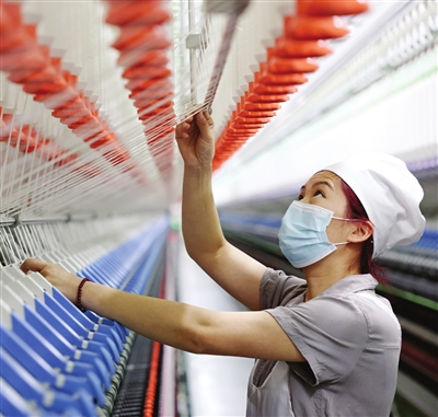 山东省枣庄经济开发区一家企业工人在加工高端纱线。 新华社发