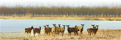 昨日,本市七里海湿地成群麋鹿在一起觅食、休息和活动,构成一幅美丽的生态画卷。本报记者 孙立伟 通讯员 王志臣 摄
