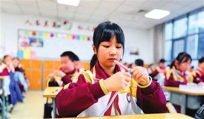 万全小学开学典礼上,同学们跟随老师现场制作“非遗”绒花,感受“非遗”技艺的魅力。 本报记者 刘欣 摄