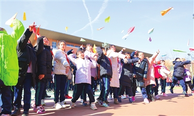 红桥区文昌宫民族小学开学典礼,学生们放飞纸飞机、航模、无人机,承载着渴望,开启新的学习旅程。 本报记者 孙立伟 摄