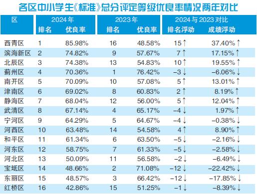 2024年天津市中小学生体质健康监测报告公布,榜单上,西青区位列榜首,滨海新区、北辰区、南开区等区域成绩优秀。这一结果令人惊叹:2023年的榜单上,它们还排名靠后,西青区更是全市垫底。仅仅一年时间,这些区域便从“倒数”变“正数”,这样的“逆袭”堪称完美。然而深入了解后,你会发现,这样的“逆袭”也并非偶然,而是自上而下系统性变革结出的果实。
