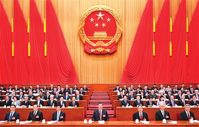 人民大会堂大礼堂气氛庄重热烈,主席台帷幕正中的国徽与会场穹顶上的五角星灯交相辉映。