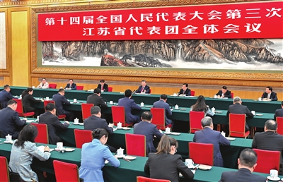 在听取大家发言后,习近平作了发言。他首先表示赞成政府工作报告,对江苏工作予以肯定,希望江苏落实好挑大梁的责任,努力取得新的更大成绩。