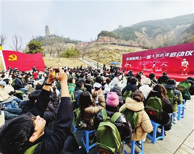 本报延安专电(记者 张雯婧 摄影 刘欣)3月7日上午,“京津冀同上一堂大思政课”活动启动仪式在陕西省延安市举行。本次活动由天津市教育两委主办,天津市延安精神研究会、天津财经大学、天津工业大学和天津开放大学承办。包括清华大学、首都师范大学、南开大学、天津大学、河北工业大学、河北大学等高校在内的京津冀三地100支大学生团队,近500名师生代表,相聚在巍巍宝塔山下,共同开启思政大课。