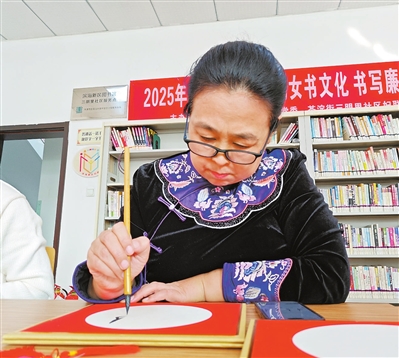 在滨海新区茶淀街道近日举办的庆“三八妇女节”活动中,市级非遗代表性项目“汉沽女书民俗文化”第四代代表性传承人周娜,向在场的女性讲述了这项“世界唯一女性文字”的故事。她还带大家用串珠编织女书手链,又用毛笔写下“家和万事兴”的女书字体,传递女书文字的独特之美。