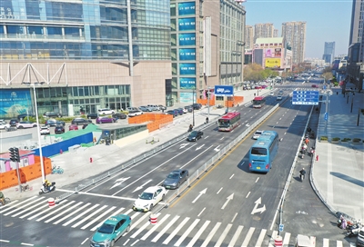 昨天,东马路恢复双向六车道通行,路口交通标线也重新施划。 记者 周伟 摄