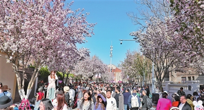马蹄声从重庆道的驿站传来,混着金属铃铛的脆响。从业20年的王师傅半跪在地上,给两匹温血马系紧红绸穗子,马鞍内侧新换的减震棉垫透着一股皮革香气。马车行至路口,不远处交管和平支队秩序管理大队交警李菁正在现场维护交通秩序,他说:“我们提前制定精细化、科学化限行措施,在工作日和节假日分别划定不同管控区域、疏导区域和分流区域,全力保障游客出行畅通。”风过处,零落的花瓣飘向大理石门廊下的青砖。和平区城管委保洁二队清洁工李红举着高压水枪的手忽然停住:“砖缝里的花瓣留着,游客爱蹲着拍照呢。”她身后的保洁车上,分格式垃圾箱贴着海棠花图案的标识。“人手增加,洒扫次数增加,设备也增加了,我们努力给大家一个干净整洁的五大道。”李红说。