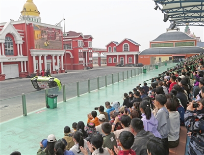 在航母机库舞台,“机甲战士”和“魔法师”同台,空气大炮、乒乓球大战、变色药水等科学秀轮番登场;“精灵木偶”带来滑稽的互动游戏,为亲子家庭打造“童话时刻”;大型实景表演《飞车特技》的表演者现场挑战高难度动作,单双车漂移、极速穿越火圈等赢得阵阵掌声。园区里,花海景观灿烂夺目,大家纷纷拿出手机拍照留念;趣味游戏区、手绘墙等构成“童趣长廊”,游客化身“小哪吒”,参与“乾坤一掷”套圈游戏。