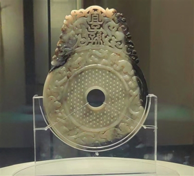 宜子孙璧,又称东汉“宜子孙”玉璧,也是国家一级文物,是一块具有代表性意义和历史文化价值的东汉吉语璧。1982年出土于山东省青州市谭坊镇马家冢子东汉墓,整块玉璧由上等新疆和田玉雕琢而成,高20.8厘米、直径15.5厘米,内径2.6厘米、厚0.6厘米。双龙钮中央透雕篆书“宜子孙”三字,这是汉代常见的吉祥语“长宜子孙”的简称,体现了墓主人希望借此保佑后代人丁兴旺、长命百岁的美好愿望。