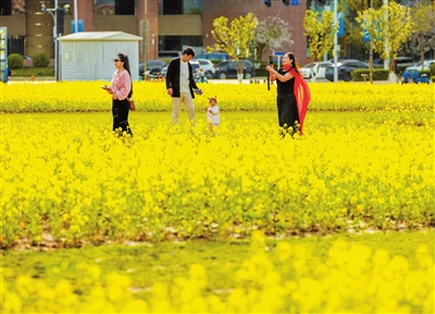 日前,位于滨海新区第二大街南北两侧的36万余盆油菜花竞相绽放。 记者 赵建伟 摄
