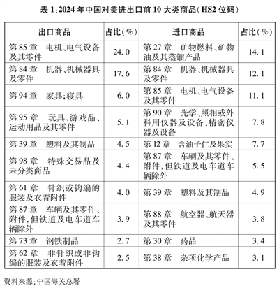 中美双边贸易互补性强。两国发挥各自比较优势,双边贸易呈互补关系(表1)。根据中国海关数据,2024年中国向美国出口前五大类商品为电机电气设备及其零附件、机械器具及零件、家具、玩具和塑料制品等,合计占比为57.2%。中国从美国进口前五大类商品为矿物燃料、机械器具及零件、电机电气设备及其零附件、光学仪器和大豆等含油子仁,合计占比为52.8%。机电产品在中美双边贸易中较为重要,产业内贸易特征较为明显。