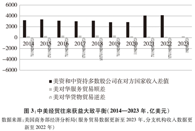 根据美国商务部数据,2023年美国对华服务贸易顺差为265.7亿美元,美国在服务贸易方面占有显著优势;2022年美资企业在华销售额高达4905.2亿美元,远高于中资企业在美786.4亿美元的销售额,差额高达4118.8亿美元,美国企业跨国经营优势更为突出。