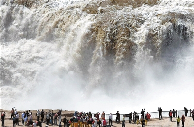 近日,受上游冰凌消融和水库调节放水影响,位于山西吉县和陕西宜川县交界的黄河壶口瀑布迎来一年一度的“桃花汛”,吸引了众多游客。 新华社发