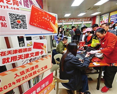 本报讯(记者 王洋 摄影 姚文生)昨天上午10时,2025年度天津文化惠民卡(以下简称文惠卡)启动发行,在天津演艺网售票大厅门前,记者看到,不少老年市民前来现场办卡。排队在第一位的市民彭新民开心地告诉记者:“我今年73岁,用文惠卡已经有10年时间了。我平时就爱看戏,今天特意来给家里四口人都办了文惠卡的戏曲卡,还半价买到了3场纪念京剧大师裘盛戎的演出票。”