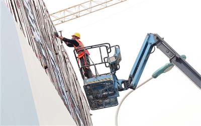 昨日,和平区南门外大街城市更新项目工地上,工人检查加固临建设施。